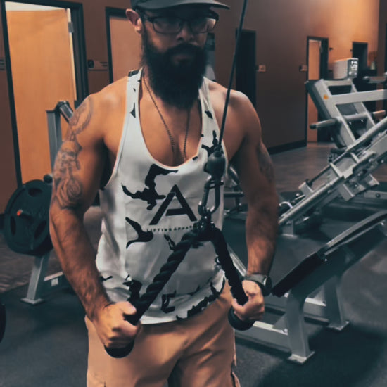 Our new white camo tank top blends sleek style with performance-ready comfort. Made from lightweight, breathable fabric, it keeps you cool during intense workouts. The subtle camouflage pattern adds a bold, athletic edge without being too flashy. Its racerback design allows full range of motion for lifting, running, or stretching. Perfect for gym sessions or casual wear, this tank top is both functional and fashion-forward
